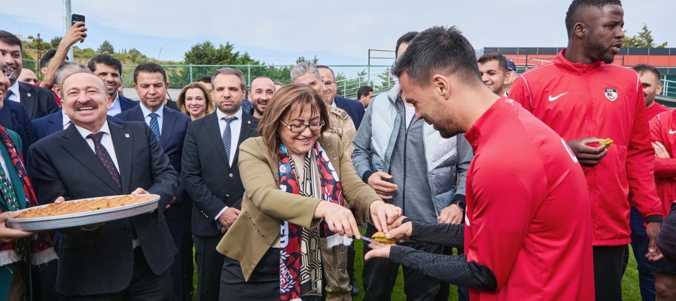 Gaziantep FK’nın oyuncu kadrosuyla Fatih Karagümrük maçı öncesi antrenman sahasında bir araya gelen Gaziantep Büyükşehir Belediye Başkanı Fatma Şahin, oyunculara moral konuşması yaparak, baklava ikram etti.