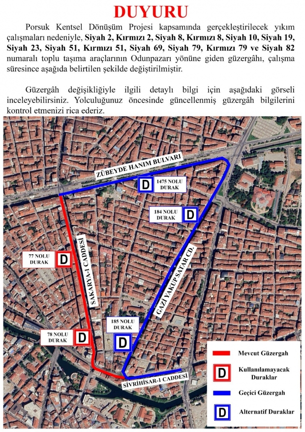 Yıkım çalışmaları nedeniyle toplu taşıma araçlarının da Odunpazarı yönüne giden güzergâhının çalışma süresince değiştirildiğini belirten yetkililer, “Şehrimiz Sivrihisar- 1 Caddesi üzerinde bulunan eski İş Bankası ve yanındaki binaların yıkım çalışmaları kapsamında 19 Mart Çarşamba gecesi saat 00.00 ile 23 Mart Pazar 00.00 arasında, Sivrihisar 1 Caddesinin Sakarya 1 Caddesi ile Gazi Yakup Satar Caddesi arasında otogar istikametinde kalan kısmı araç trafiğine kapatılacaktır. Ayrıca tramvay hattı kullanan vatandaşlarımız Yıldız Durağında (Kumlubel yönü) yolcu iniş ve biniş yapamayacaktır. Çalışmalar nedeniyle Siyah 2, Kırmızı 2, Siyah 8, Kırmızı 8, Siyah 10, Siyah 19, Siyah 23, Siyah 51, Kırmızı 51, Siyah 69, Siyah 79, Kırmızı 79 ve Siyah 82 numaralı toplu taşıma araçlarının Odunpazarı yönüne giden güzergâhı güncellenmiştir. Sürücülerin trafik işaret ve işaretçilerine uymaları, alternatif güzergâhları kullanmaları rica olunur.” açıklamasında bulundu.