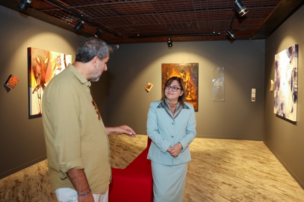 Başkan Şahin, ilk olarak İskender Pala’nın 13 romanının ressamların gözünden yansıtıldığı “Kelimeler ve Renkler” sergisini gezdi. Sergide, Pala’nın “Babil’de Ölüm İstanbul’da Aşk”, “Katre-i Matem”, “Şah ve Sultan” gibi eserlerini temsil eden tablolar dikkat çekti. Sanatçılar, Pala’nın edebi dünyasını renklerin diliyle sanatseverlere sunarken, Şahin de sanatçıların özgün yorumlarına hayran kaldığını ifade etti.