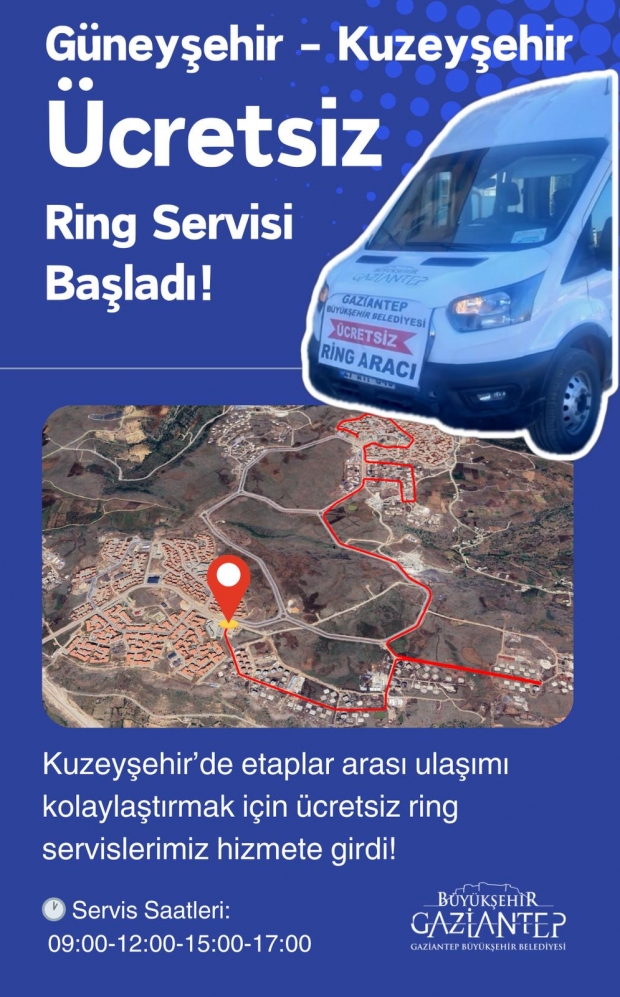 Kenttin konut ihtiyacını karşılamak, sıkışan şehir yapısını rahatlatmak için Gaziantep Büyükşehir Belediyesi tarafından projelendirilip oluşturulan Kuzeyşehir ve Güneyşehir Uydu Kentleri’nde yatırımlar devam ediyor. Uydu kentlerde etaplar arası ulaşımı kolaylaştırmak için Büyükşehir Belediyesi Ulaşım Daire Başkanlığı tarafından başlatılan ring seferleri kapsamında 09.00, 12.00,15.00, 17.00 hareket saatleriyle günde toplamda 4 ring seferi yapılacak.