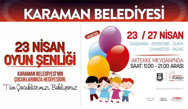 Karaman Belediyesi, bu 23 Nisan’da da çocukları unutmadı. Her yıl birbirinden renkli ve çeşitli etkinliklerin yer aldığı çocuk şenliğine ev sahipliği yapan Aktekke 15 Temmuz Demokrasi Meydanı’nda bu yıl da çocuklar doyasıya eğlenecek. Tiyatro gösterileri ve birçok oyun alanı, çocuklara unutamayacağı 5 gün yaşatacak. Şenlik kapsamında 23 Nisan Çarşamba gününden 27 Nisan Pazar gününe kadar, 11.00 – 21.00 saatleri arası çocuk oyun grupları ücretsiz olacak.