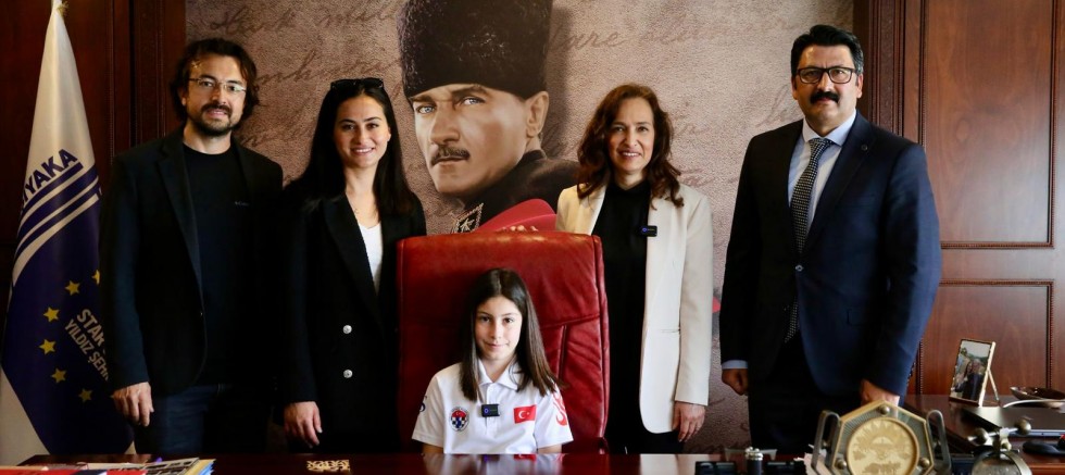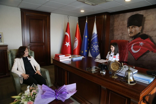 Karşıyaka Belediyesi’nin 23 Nisan Ulusal Egemenlik ve Çocuk Bayramı dolayısıyla düzenlediği etkinlikler büyük coşkuya sahne olurken, Başkan Yıldız Ünsal bu sabah makamını Mehmet Seniye Özbey İlkokulu öğrencisi Eslem Tolan’a devretti. Avrupa ve Türkiye çapında satranç şampiyonlukları bulunan Eslem’i kutlayan Başkan Ünsal, çocuklara yönelik çalışmaları hakkında bilgi verdi. Ünsal, küçük başkanın taleplerini de dinledi; ilçedeki okullara kitap dağıtılması ve satranç turnuvası düzenlenmesi gibi önerilerini en kısa zamanda yerine getireceklerini söyledi. Ardından Başkan Ünsal ve Eslem Tolan, Karşıyaka Hükümet Konağı bahçesinde düzenlenen törene katıldı. Atatürk Anıtı’na çelenklerin sunulduğu törende, Ulu Önder ile mücadele arkadaşları sonsuz saygı ve minnetle anıldı.