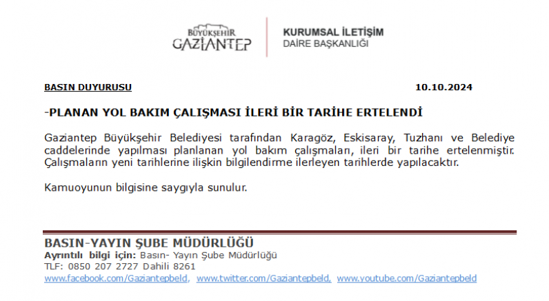 Gaziantep Büyükşehir Belediyesi tarafından Karagöz, Eskisaray, Tuzhanı ve Belediye caddelerinde yapılması planlanan yol bakım çalışmaları, ileri bir tarihe ertelenmiştir. Çalışmaların yeni tarihlerine ilişkin bilgilendirme ilerleyen tarihlerde yapılacaktır.