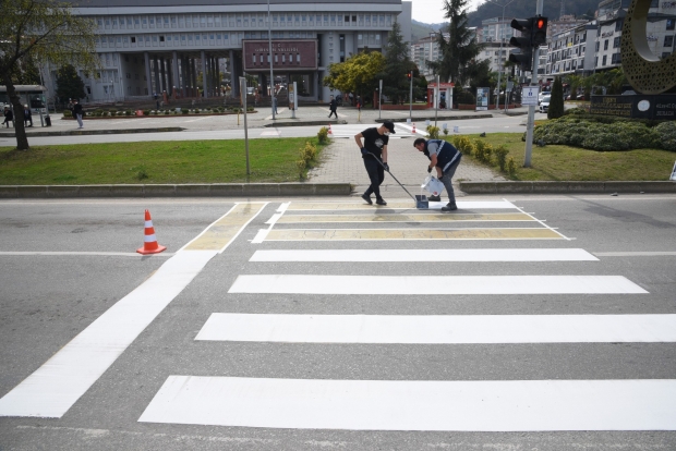 Zabıta ekipleri, yaya geçitlerinin daha belirgin hale gelmesi ve toplu taşıma araçlarının duraklama alanlarının net bir şekilde işaretlenmesi için bu çalışmayı gerçekleştiriyor.